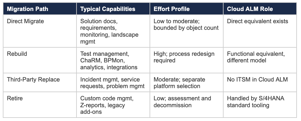 Not everything in Solution Manager goes to Cloud ALM. This is the single most important thing to understand early. Each component in your inventory will follow one of four migration paths, determined by what Cloud ALM offers and what it does not.