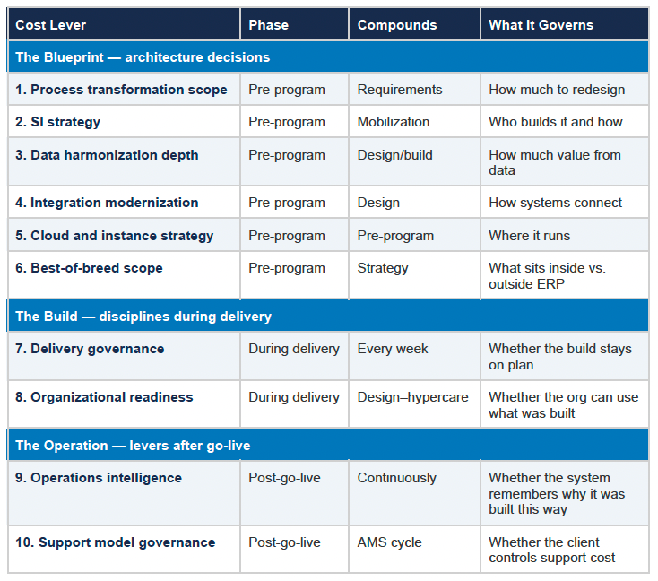 This is not an unusual story. It is the default story. And the reason it keeps happening is that the industry frames ERP cost management as a pre-project exercise. Choose the right implementation path. Set the right architecture. Pull the right levers before delivery starts. That framing is correct, but it is incomplete. It accounts for six of the ten levers that determine total transformation cost. The other four are invisible in most business cases.